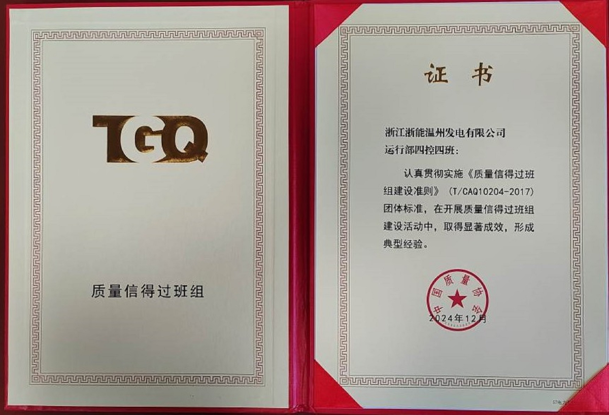 溫州發(fā)電公司運行部四控四班“全國質(zhì)量信得過班組”榮譽證書。 王儷穎 攝