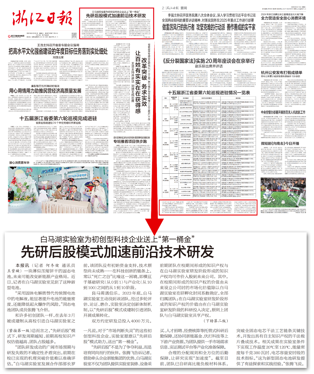 《浙江日報(bào)》3月15日頭版報(bào)眼報(bào)道白馬湖實(shí)驗(yàn)室為初創(chuàng)型科技企業(yè)送上“第一桶金”,先研后股模式加速前沿技術(shù)研發(fā)。