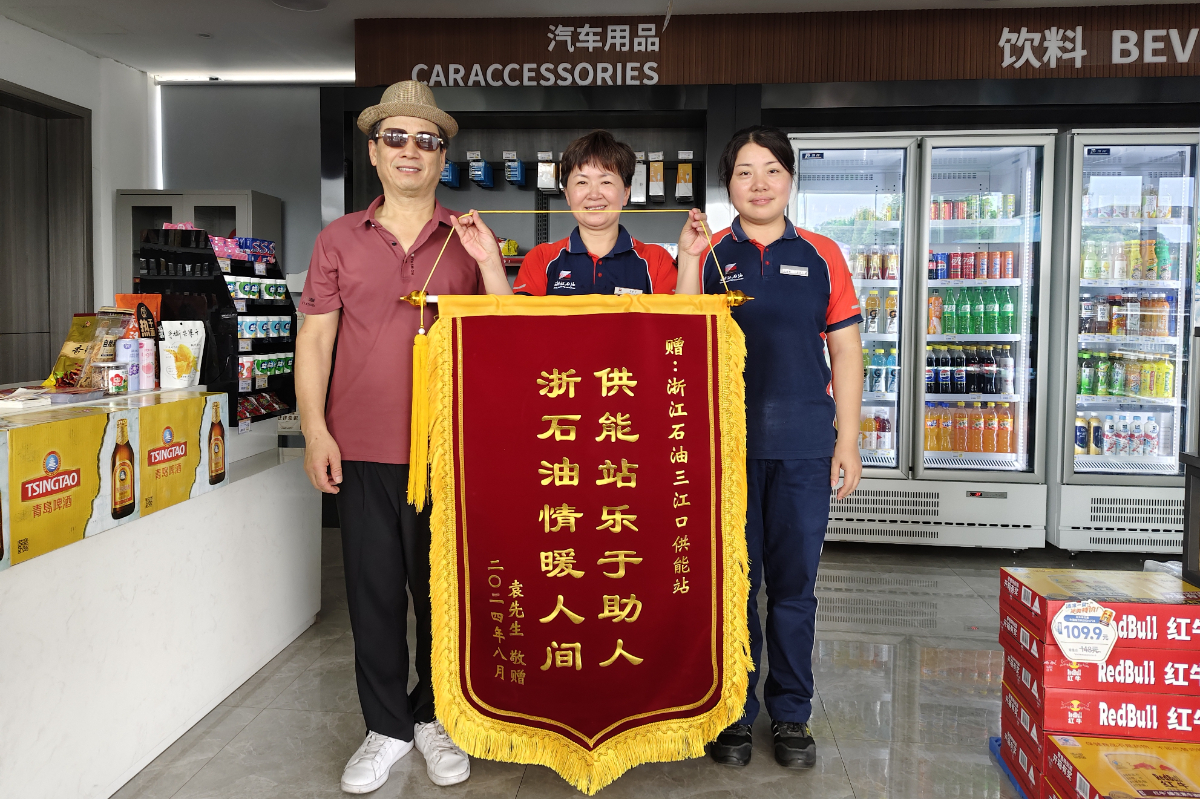 嵊州市民向浙石油紹興嵊州三江口站贈送錦旗,感謝危急時(shí)刻的生命救助。 王浙攀 攝