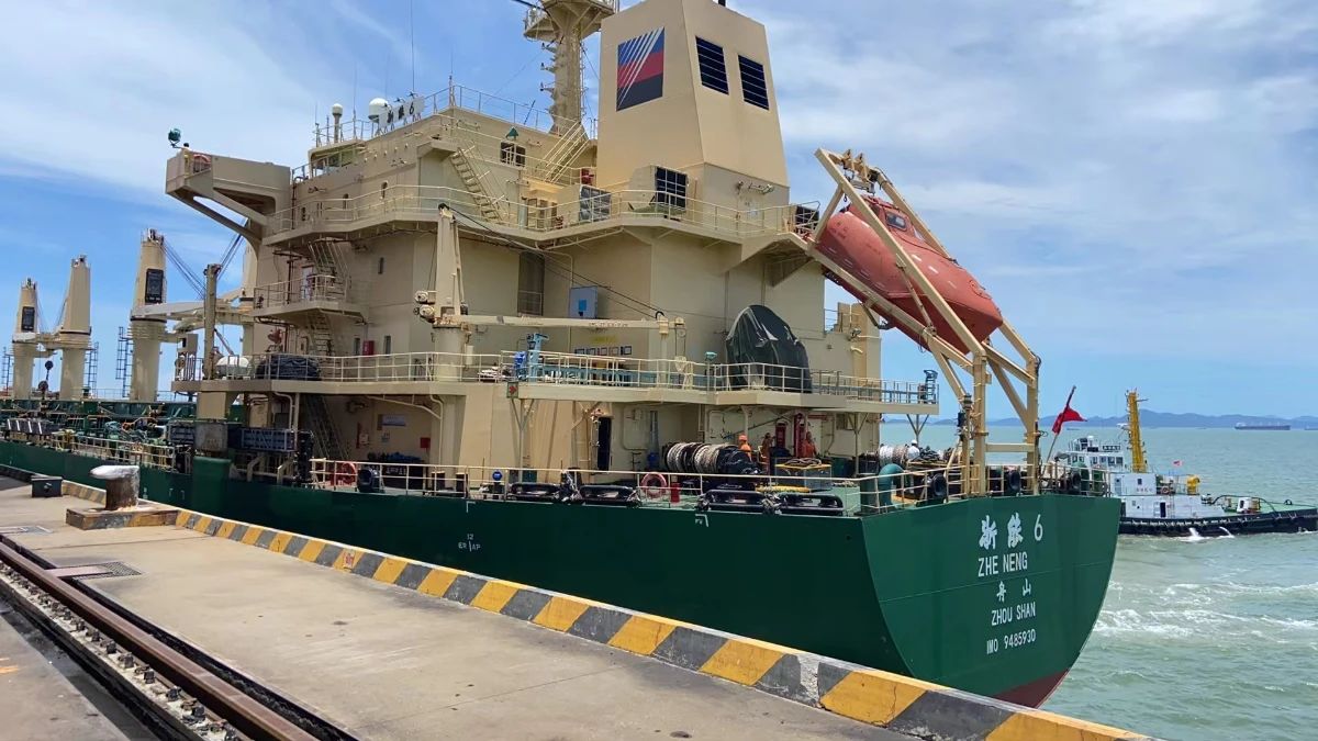 “浙能6”輪在電廠泊位搶卸煤炭。 鐘發(fā)春 攝