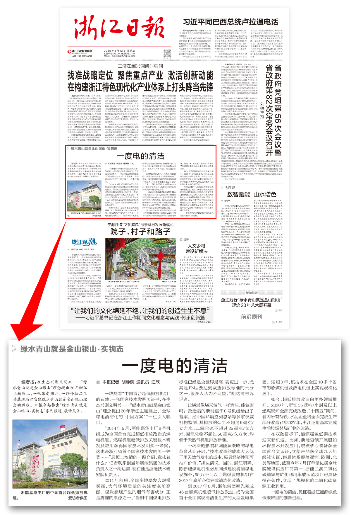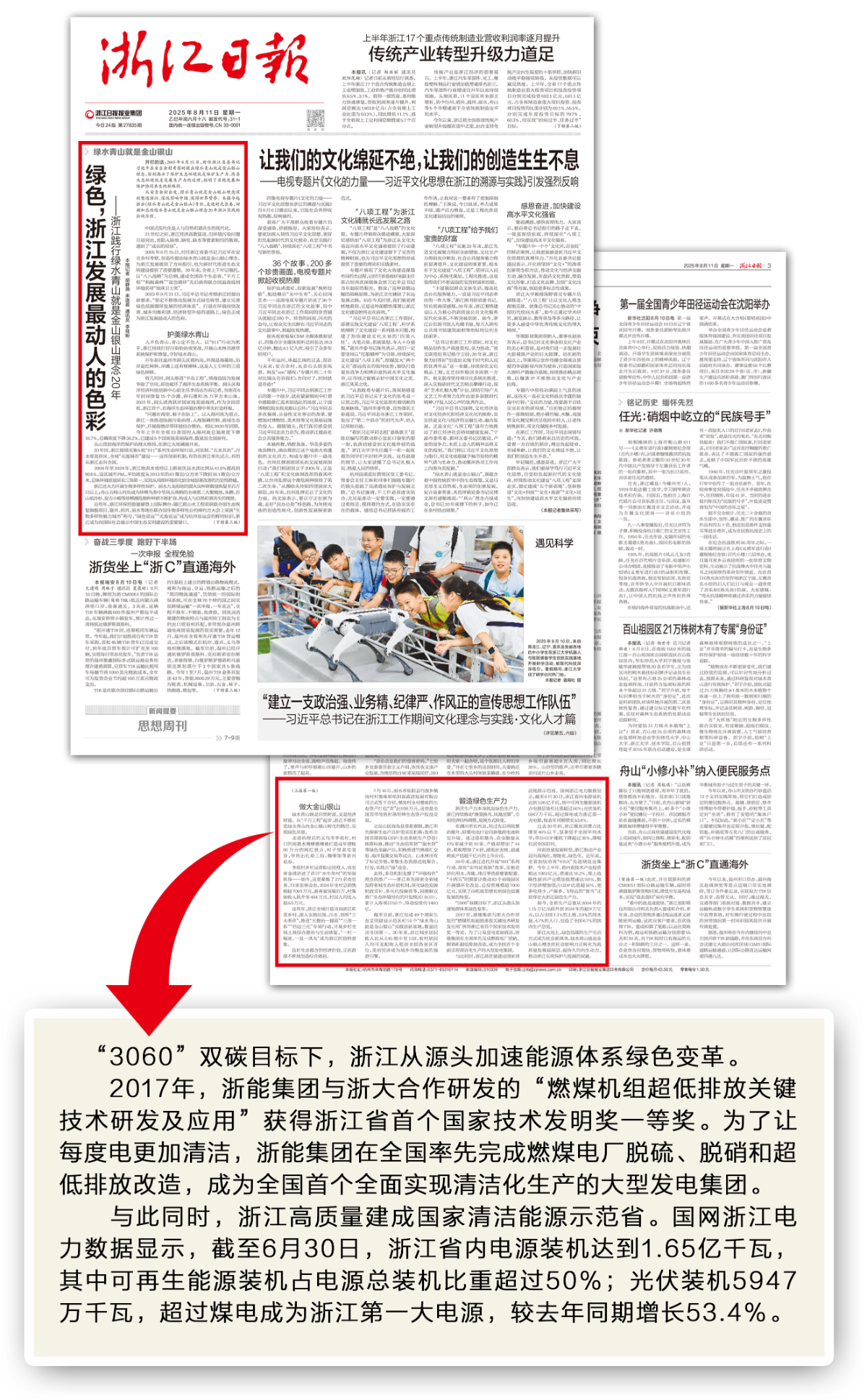 8月13日起,《浙江日?qǐng)?bào)》推出“綠水青山就是金山銀山·實(shí)物志”系列報(bào)道,開(kāi)欄首篇在頭版刊發(fā)《一度電的清潔》,見(jiàn)證多年來(lái)浙江能源綠色低碳轉(zhuǎn)型的創(chuàng)新進(jìn)程。
