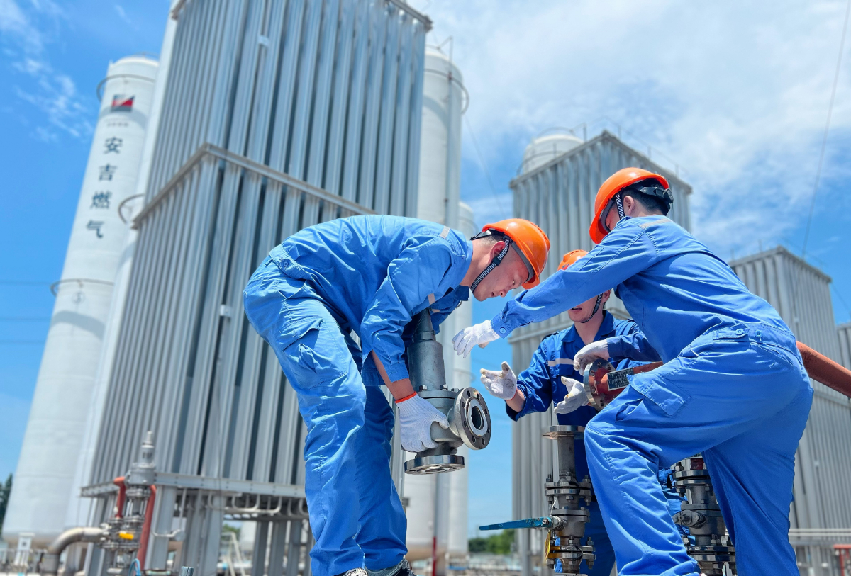 高溫將設備烤得滾燙,浙能燃氣安吉公司場站運行人員嚴謹做好設備維護保障,確保全縣平穩供氣。 包融融 攝