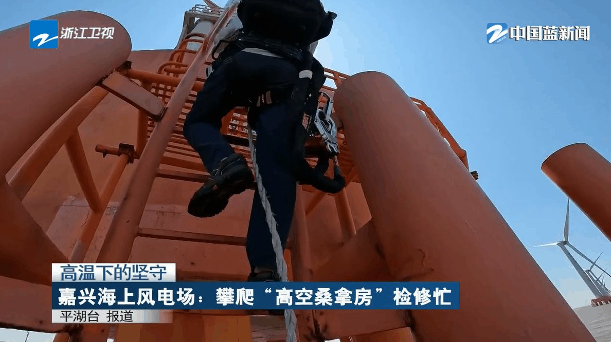 浙江衛視《浙江新聞聯播》報道浙能嘉興1號海上風場攀爬“高空桑拿房”檢修忙。 周晨 提供