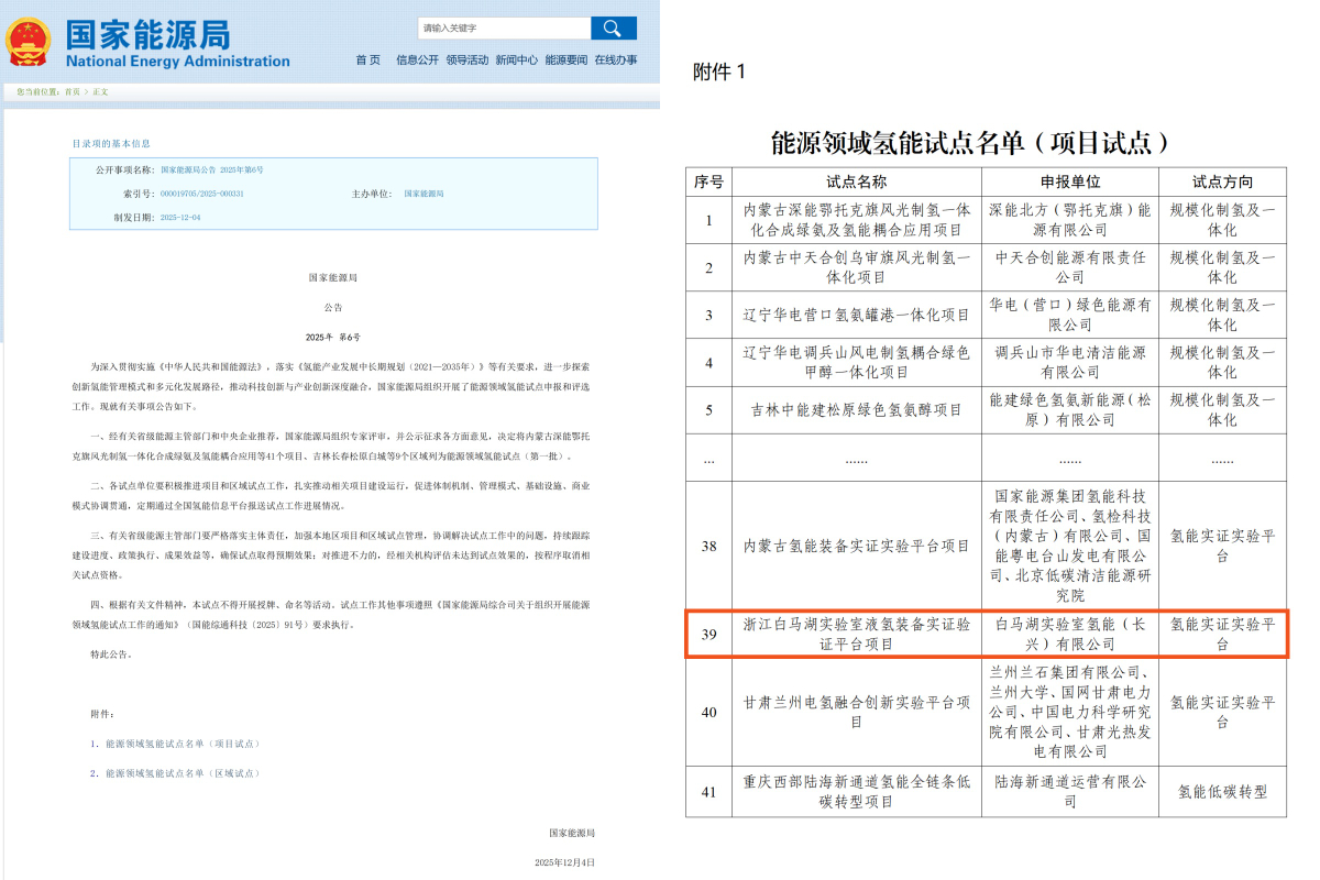 本網訊 近日,國家能源局正式發布能源領域氫能試點(第一批)名單,由白馬湖實驗室氫能(長興)有限公司申報的“液氫裝備實證驗證平臺”項目成功入選。
