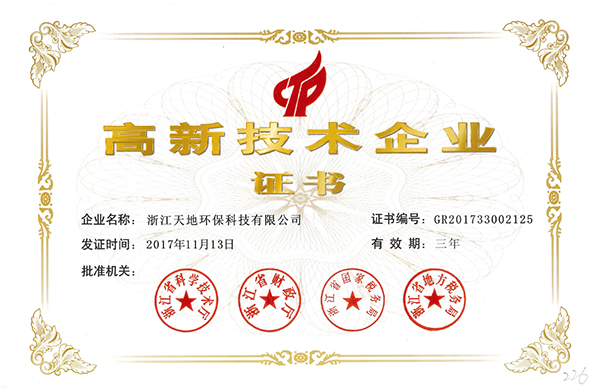 近日,浙江天地環保科技有限公司獲得了由浙江省科學技術廳、浙江省財政廳、浙江省國家稅務局、浙江省地方稅務局聯合頒發的《高新技術企業證書。自2008年初次通過國家高新企業認定以來,天地公司已連續四次通過國家高新企業認定。國家高新技術企業評定是國家對具有自主知識產權的高科技企業的一項扶持政策,是我國科技創新類最高獎項之一。天地公司再次獲得認證標志著該公司在環境治理行業創新領域連續十年得到了國家相關部門的肯定。