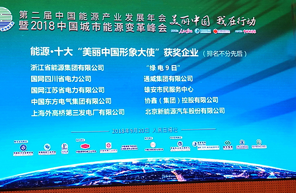 9月20日,在北京舉辦的 “第二屆中國能源產業發展年會暨2018中國城市能源變革峰會”上,浙能集團榮獲“能源·2018十大‘美麗中國形象大使企業’”榮譽稱號,受到大會表彰。本次活動由《人民日報》、國家電網公司指導、《中國能源報》主辦,活動的主題是“美麗中國·我在行動”。