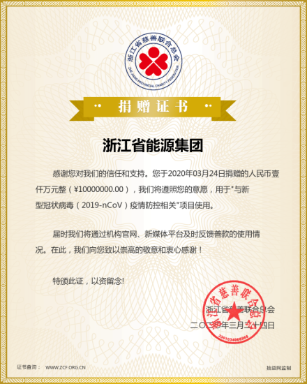 3月24日,浙能集團收到浙江省慈善聯合總會頒發的捐贈證書,集團作為首個響應浙江省慈善聯合總會的省屬企業,所屬10家企業共向浙江省慈善聯合總會捐款1000萬元。