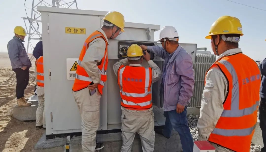 職工們進(jìn)行并網(wǎng)前箱式變壓器檢查
