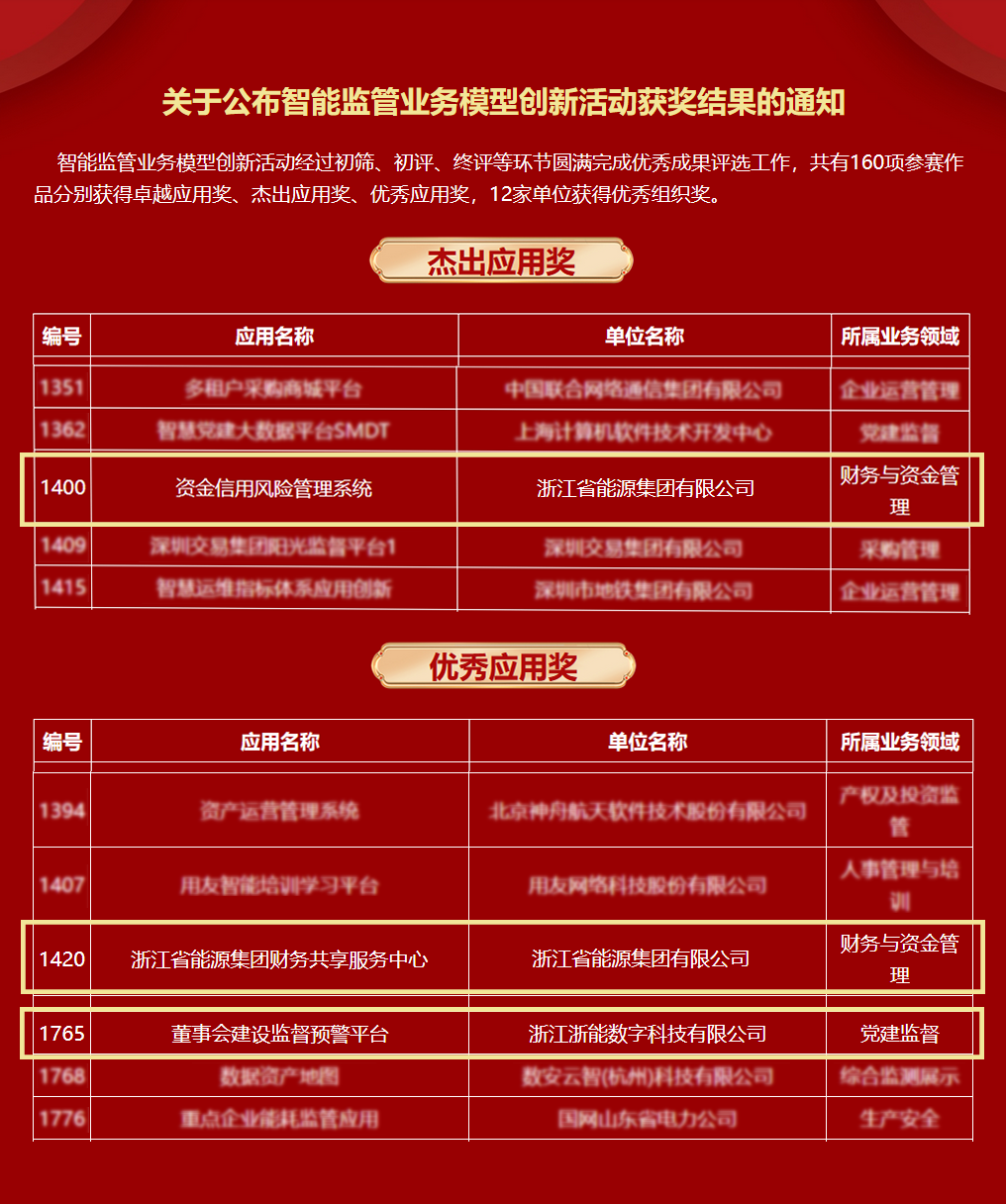 近日,國務(wù)院國資委2023年智能監(jiān)管業(yè)務(wù)模型創(chuàng)新活動(dòng)獲獎(jiǎng)名單揭曉,浙能集團(tuán)《資金信用風(fēng)險(xiǎn)管理系統(tǒng)》榮獲“杰出應(yīng)用獎(jiǎng)”,《財(cái)務(wù)共享服務(wù)中心》《董事會(huì)建設(shè)監(jiān)督預(yù)警平臺(tái)》榮獲“優(yōu)秀應(yīng)用獎(jiǎng)”。