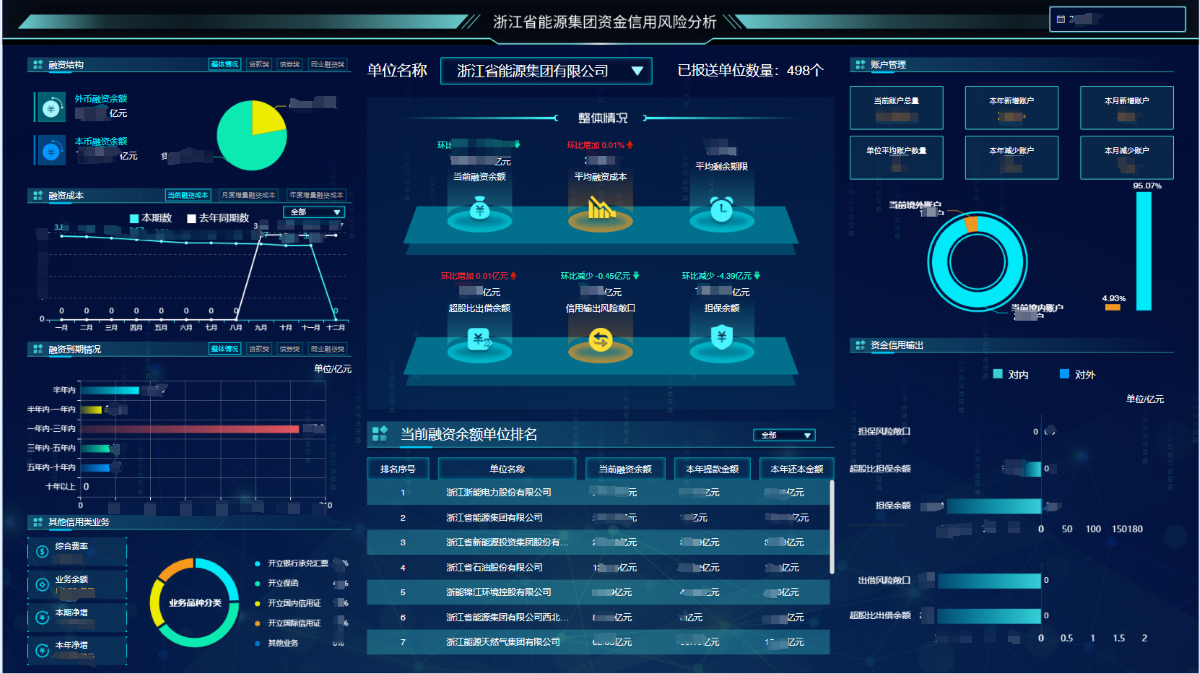 資金信用風(fēng)險(xiǎn)管理系統(tǒng)分兩部分,一是部署于省國資委財(cái)務(wù)風(fēng)險(xiǎn)監(jiān)測(cè)平臺(tái)下的資金信用風(fēng)險(xiǎn)子系統(tǒng),應(yīng)用于省國資委及各省屬企業(yè),旨在加強(qiáng)國資國企資金信用風(fēng)險(xiǎn)監(jiān)測(cè);二是部署于浙能集團(tuán)的資金管理系統(tǒng),旨在提升資金管理精細(xì)化、集約化及智能化水平,提高資金運(yùn)營效率,防范資金風(fēng)險(xiǎn)。到目前,國資委側(cè)系統(tǒng)已完成17家省屬企業(yè)集團(tuán)推廣,企業(yè)側(cè)系統(tǒng)已完成浙能集團(tuán)約500家成員單位推廣。歷經(jīng)多次版本更迭,系統(tǒng)功能不斷完善,已實(shí)現(xiàn)賬戶全生命周期閉環(huán)管理、融資業(yè)財(cái)一體化管理、債務(wù)風(fēng)險(xiǎn)預(yù)警、資金信用輸出風(fēng)險(xiǎn)監(jiān)測(cè)、大屏智能化分析等功能,切實(shí)提升省屬國資國企資金信用風(fēng)險(xiǎn)管理水平。