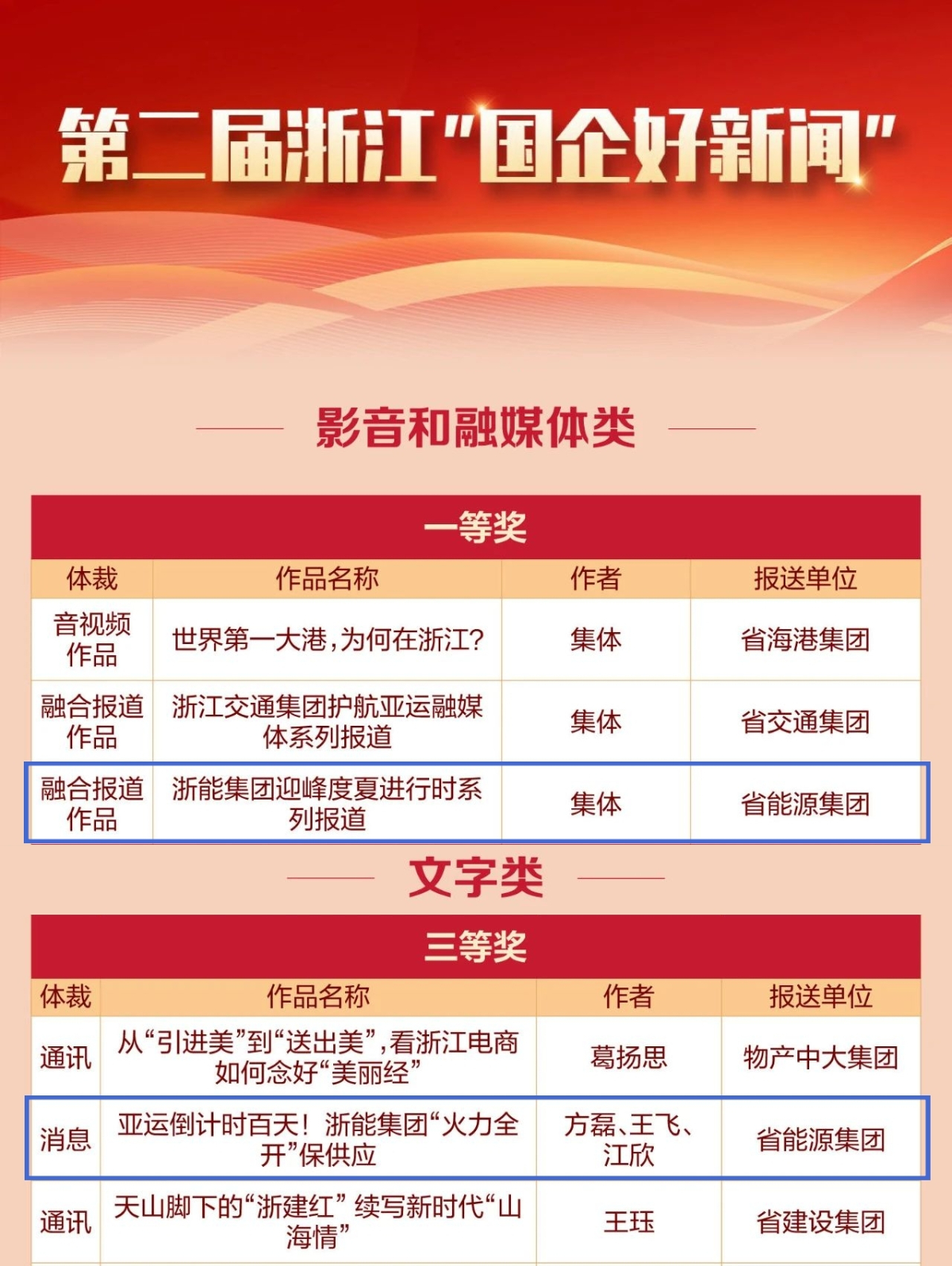 近日,第二屆浙江“國企好新聞”推介結果正式公布,由浙能集團選送的《浙能集團迎峰度夏進行時系列報道》獲影音和融媒體類一等獎,《亞運倒計時百天!浙能集團“火力全開”保供應》獲文字類三等獎,全面展示了新時代國資國企新聞宣傳工作成效,積極傳播了國資國企正能量。