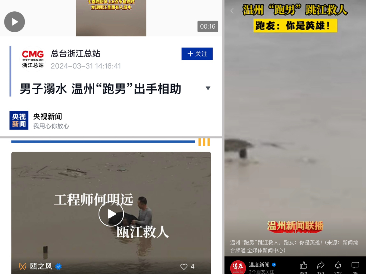 3月30日,浙石油綜合能源銷售有限公司浙南黨支部黨員何明遠(yuǎn)在晨跑途中遇人落水,危急關(guān)頭他挺身而出,奮不顧身跳入甌江成功施救,用勇敢善舉踐行浙江國資國企新風(fēng)尚,事跡獲央視新聞和當(dāng)?shù)匦侣劽襟w轉(zhuǎn)載報(bào)道。